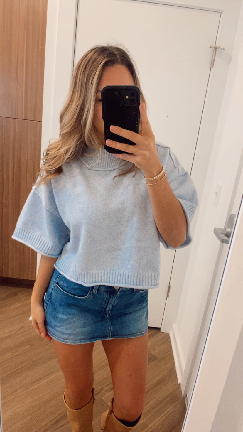 Our Brynn Sweater is a knit mock neck, short sleeve sweater. Featuring wide short sleeves with rubbed cuffs. Fits true to size, maddie wears a small!