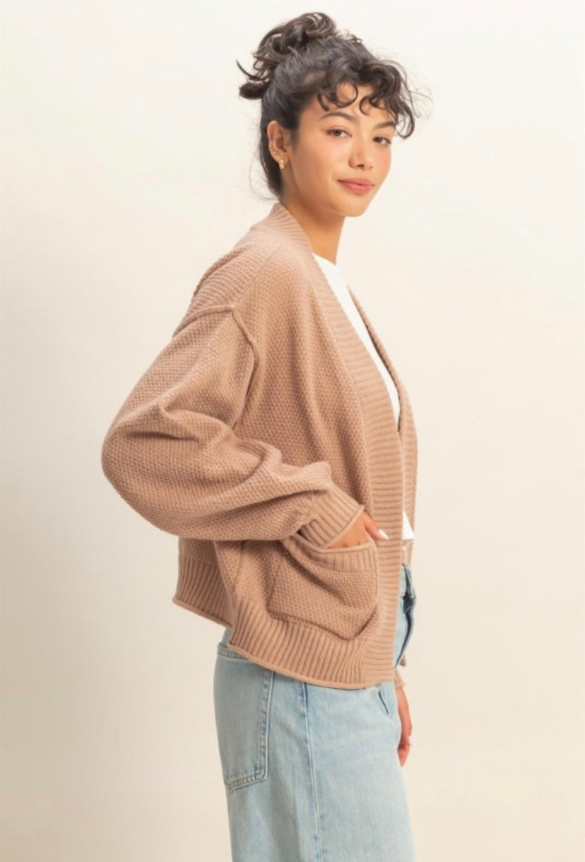 Our Kinley is a knit oversized cardigan with two pockets! In a beautiful taupe color. Maddie wears a small