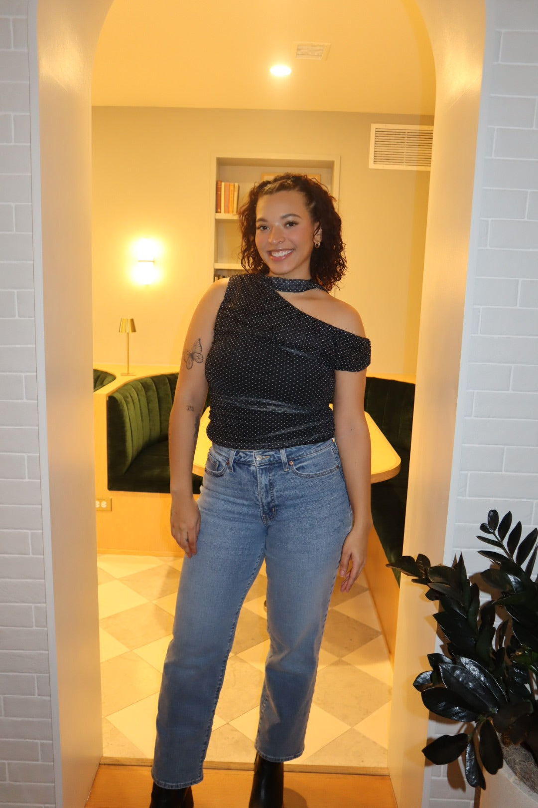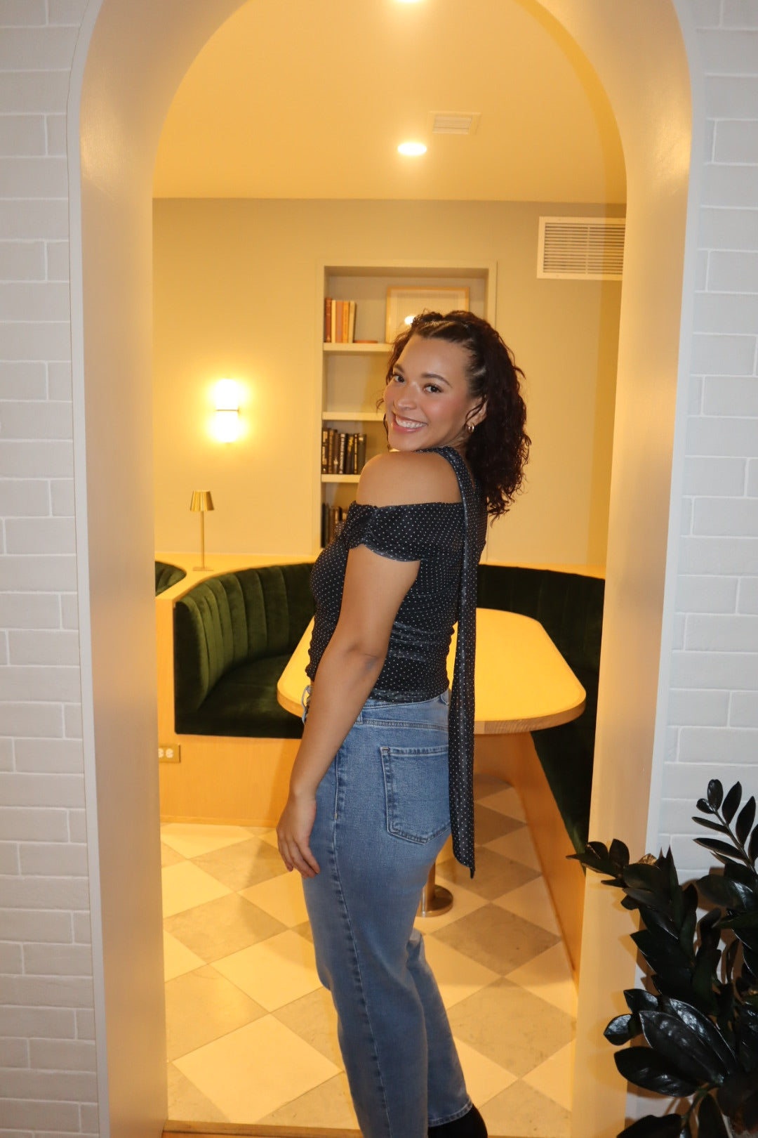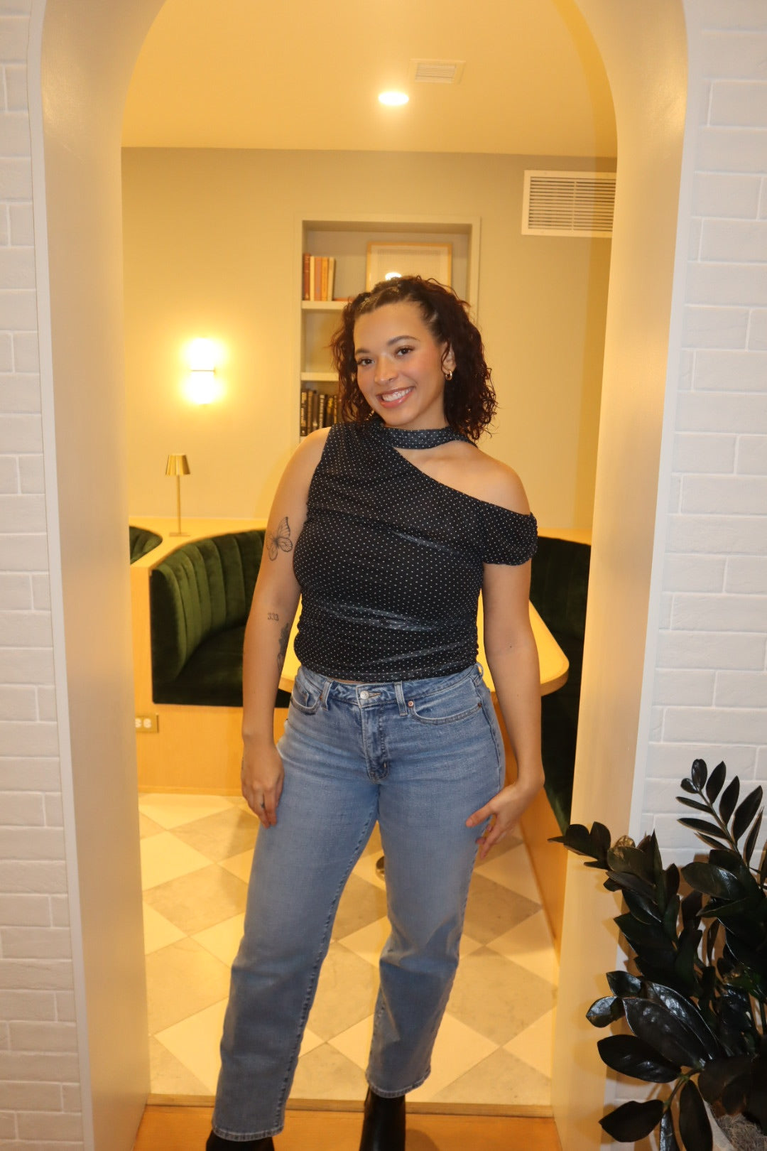 Our Luna polka dot top is a asymmetrical shoulder top featuring an attached scarf for an elevated look. The top is a mesh material with a sheer layer. The top us a good stretch and a comfy fit.